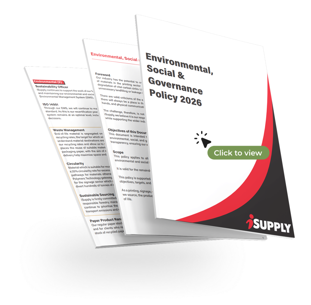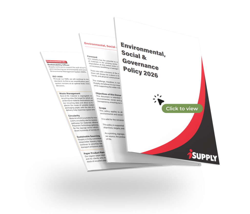 Multinational company, or environmentally conscious individual. Environmental, Social, and Governance (ESG) reporting, or small targets to reduce your personal carbon footprint in whatever way you can. iSupply is here to help, while allowing you to promote yourself or your business in a way that catches the eye and is guilt free. With the Corporate Sustainability Reporting Directive (CSRD) incoming, and more and more companies feeling the pressure of reaching their environmental targets, you need to know that your supplier is doing everything in their power to limit their carbon footprint, and consequently, limit yours in the process. Through our environmental initiatives, constant scoping of suppliers to see who is putting their money where their mouth is, and research into innovation in the industry, iSupply has positioned itself as the perfect Sustainable Printing Partner.